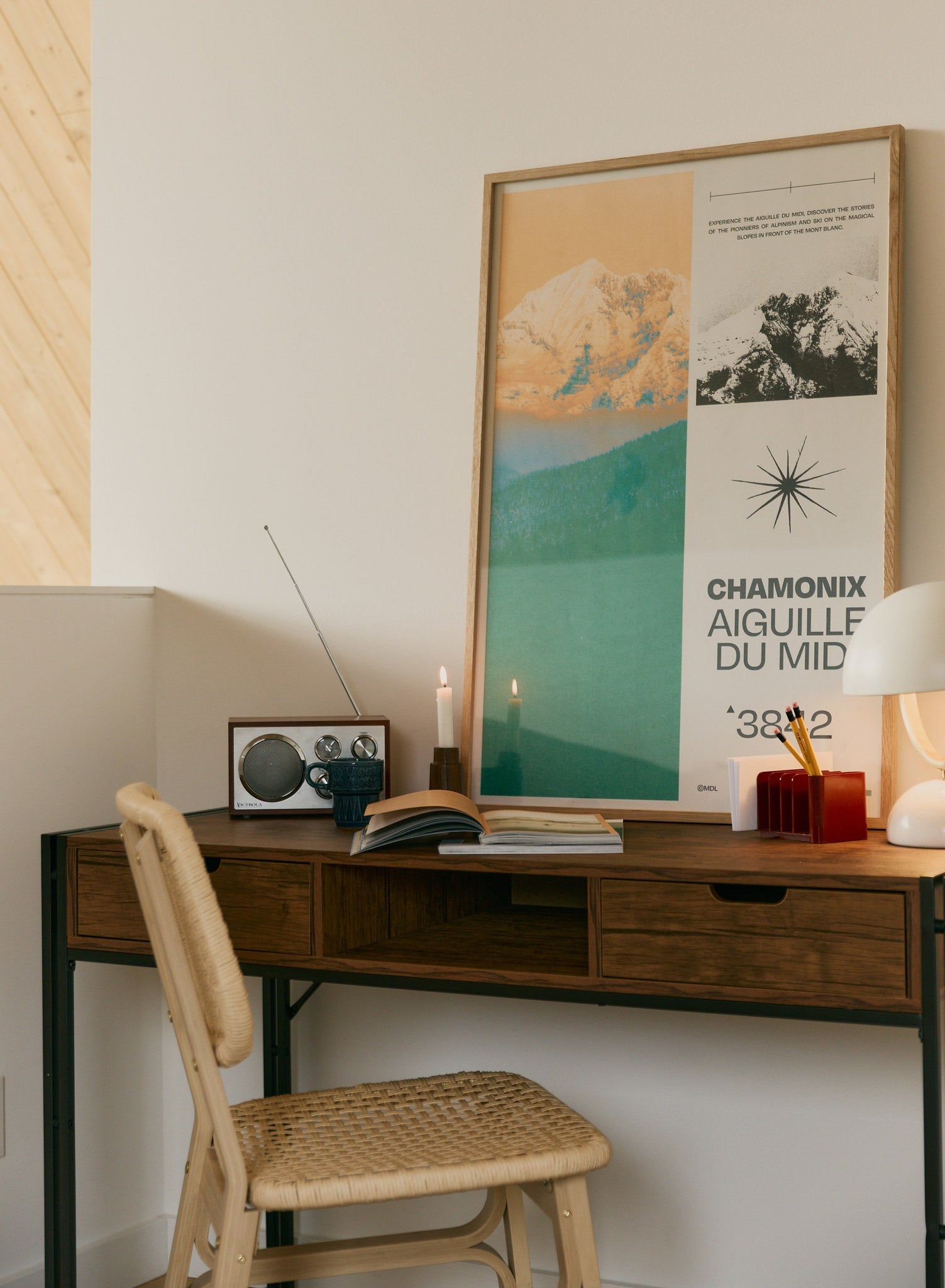 The 'Midday Needle' or 'Aiguille du midi' is a 3842 meter high mountain in the Chamonix region of the Alps. Until you can visit this iconic ski destination, enjoy this vintage poster showing the mountain under stunning orange sunset lighting.