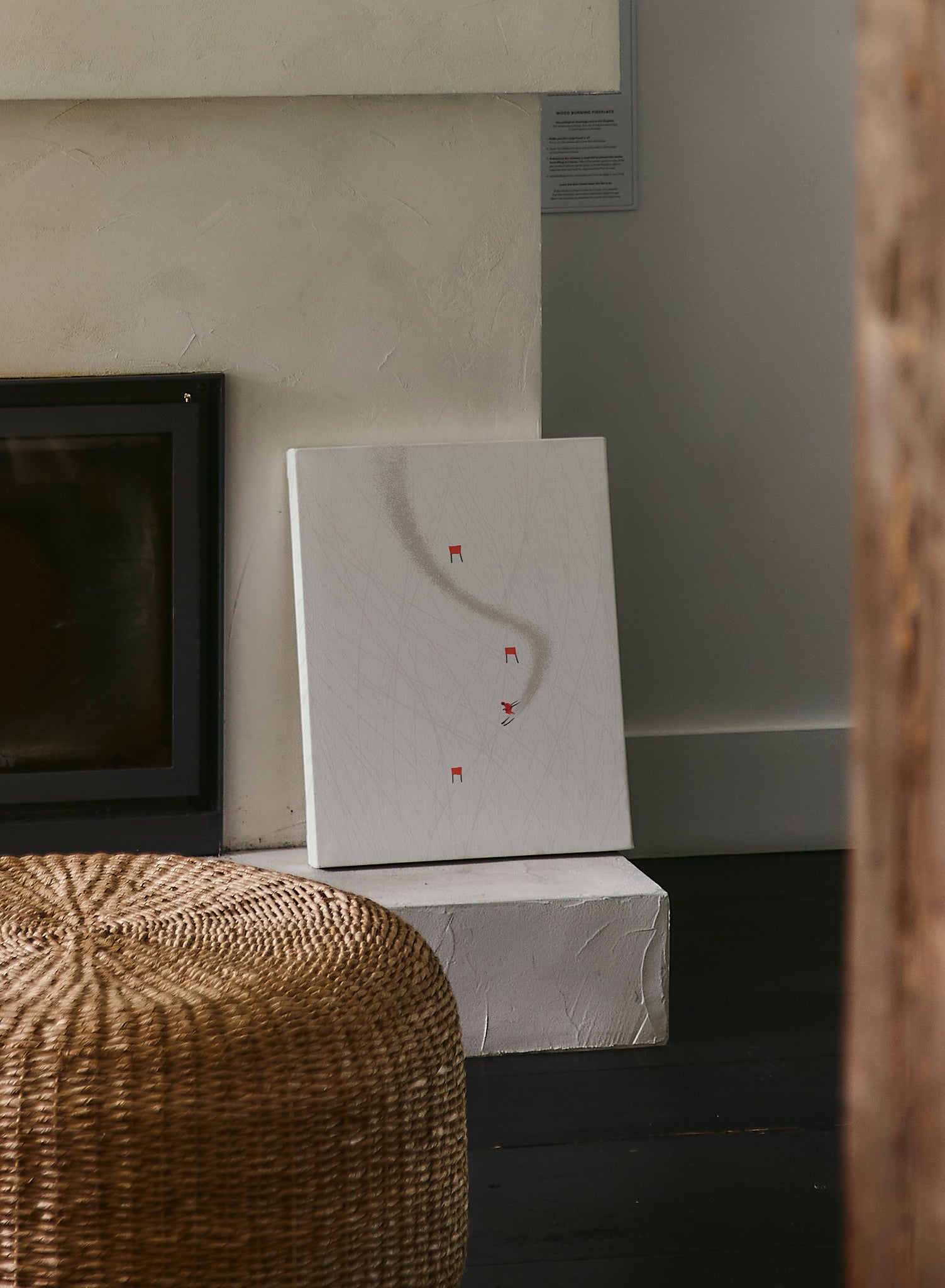 All skiers know it: a 'Powder Day' is a great day on the slopes! This minimalist winter illustration features a skier dressed in red zig zagging around flags on a snowy hill.